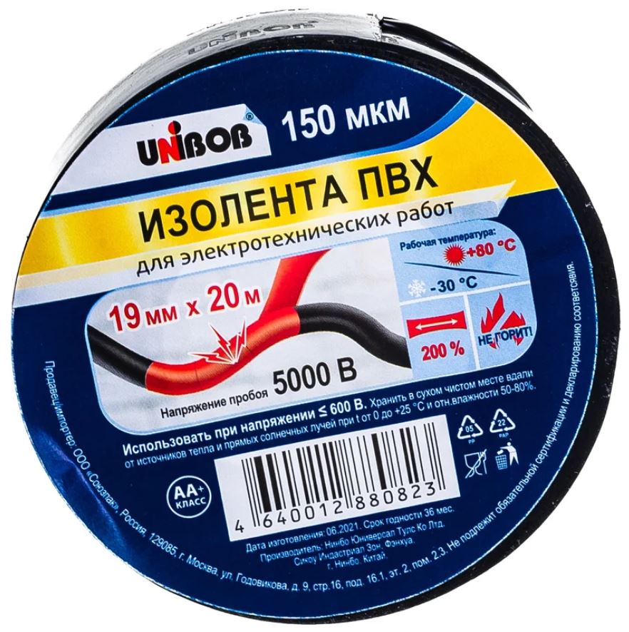 Изолента ПВХ 19/20 черная, 150мкм / UniBob