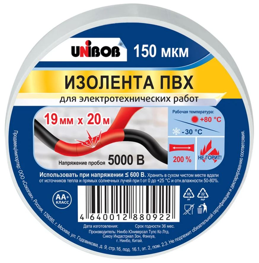 Изолента ПВХ 19/20 белая, 150мкм / UniBob