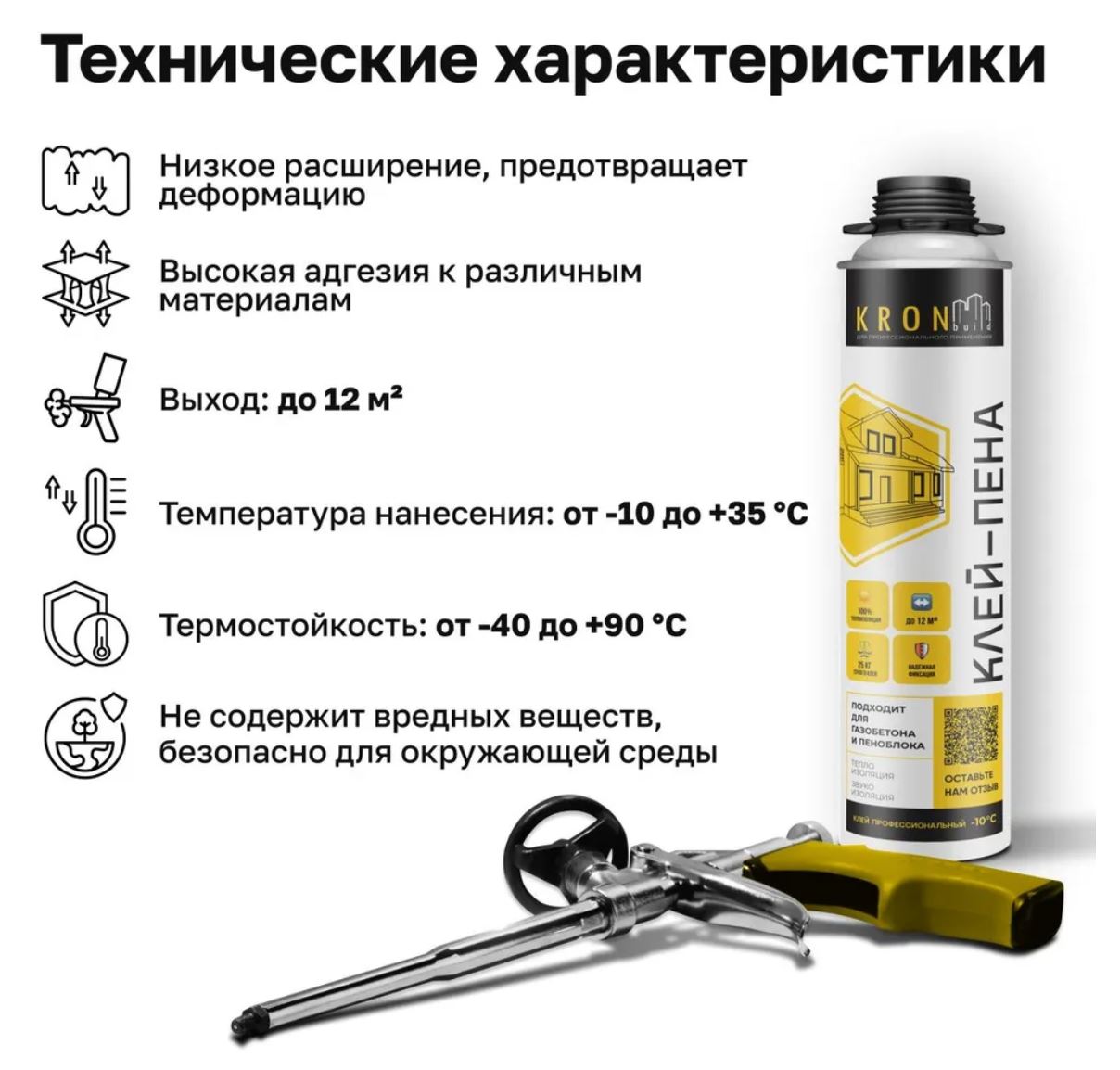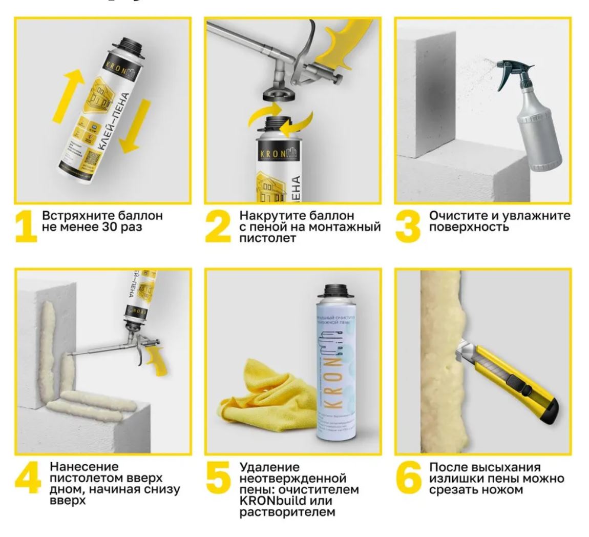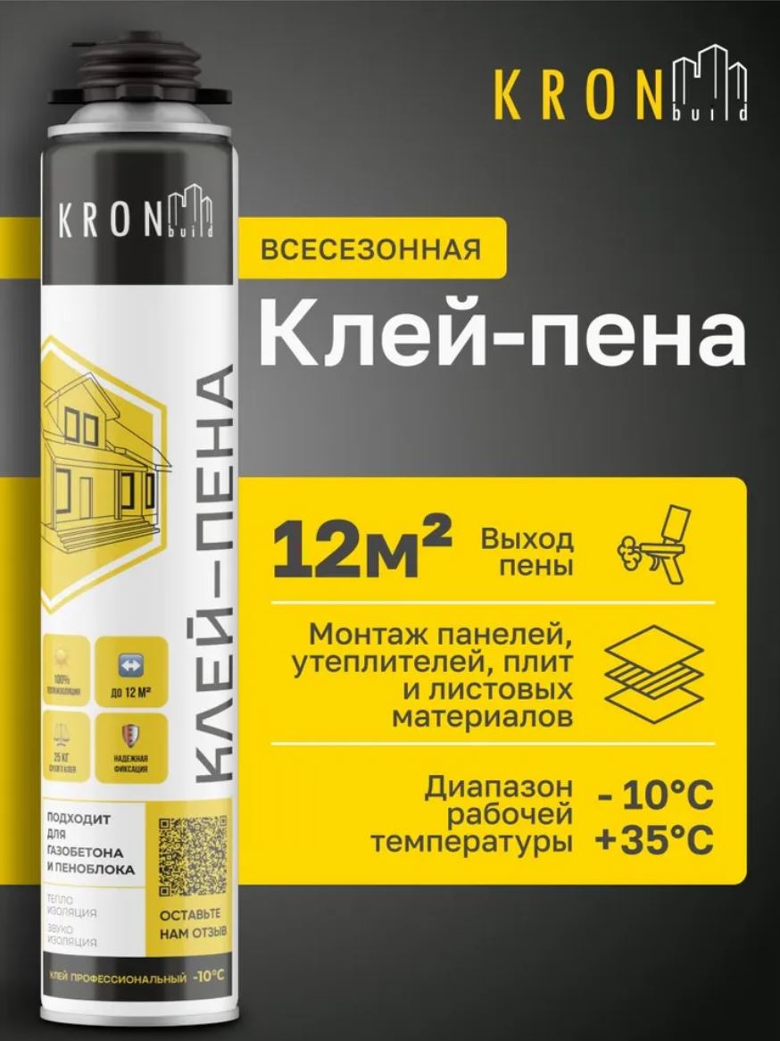 Клей-пена Kronbuild представляет собой профессиональный полиуретановый клей с увеличенной адгезией к различным основаниям. Устойчив к старению, плесени, влажности. Имеет отличную адгезию к цементным штукатуркам, бетону, плитам OSB, дереву и дсп.