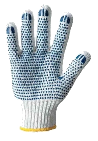 Рукавицы хлопковые с ПВХ производятся из прочной хлопчатобумажной ткани, усиленной точечным полимерным покрытием на наладоннике. ПВХ наладонник не только обеспечивает повышенное сцепление, но и увеличивает срок эксплуатации рукавиц. Рукавицы предназначены для защиты кожи рук от грубых механических воздействий. Применяются для работы со стеклом и пластмассами, уборочных и складских, а также на дачных и садовых участках.