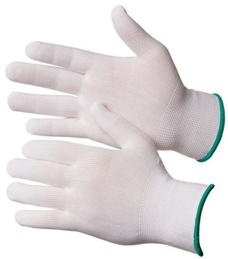 Чистые перчатки из белой нейлоновой пряжи. Бесшовная основа 13го класса вязки прекрасно вентилируется и не оставляет ворсинок. Универсальны, применяются для любых механических работ. Двойной оверлок с латексным кольцом обеспечивает превосходную фиксацию перчатки на запястье. Цветная индикация размера по оверлоку.