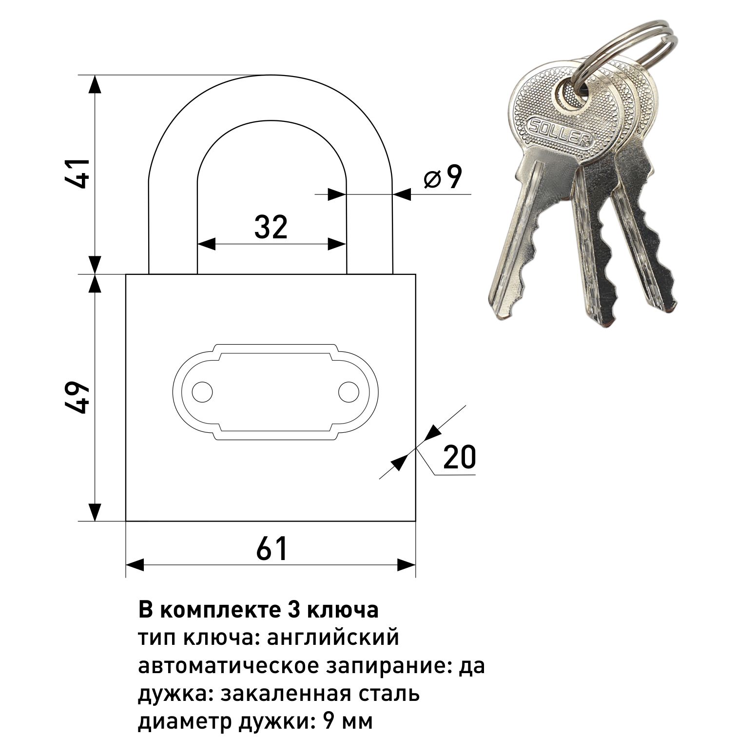 Замок навес. HG366-63-1 d10мм 3 ключа глянц. SOLLER