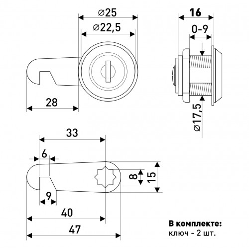 Замок почтовый устанавливается путем врезки на дверцу почтового ящика для защиты корреспонденции. Длина врезной части - 16 мм. Имеет стандартный диаметр 20 мм под замочную выемку, поворотный прочный ригель с крюком на конце. В комплекте 2 ключа. Подойдет также для любых металлических шкафов, секций хранения в магазинах.