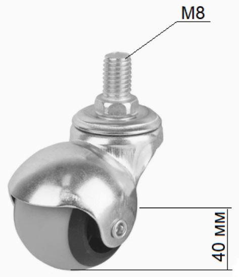 Шаровое колесо поворотное для мебели с резьбой М8 диаметром 40 мм - предназначено для передвижения разнообразных журнальных столиков, тумбочек, стеллажей или сервировочных тележек. Упаковано в по 4 шт в полиэтиленовые пакеты. Крепится в забивные или врезные муфты, втулки или усовые гайки.