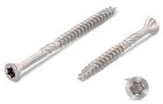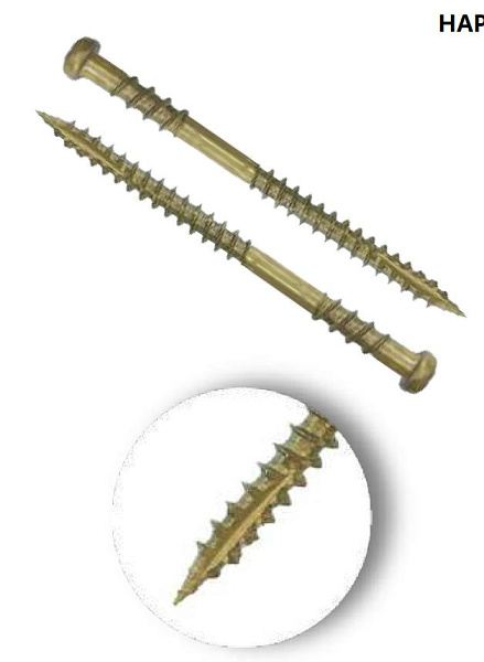 Саморез для крепления террасной доски Hapatec с декоративной уменьшенной головкой стилизованный под старину. Шуруп имеет паз на острие для высверливания посадочного отверстия, зенкующие ребра над резьбой и декоративную головку.