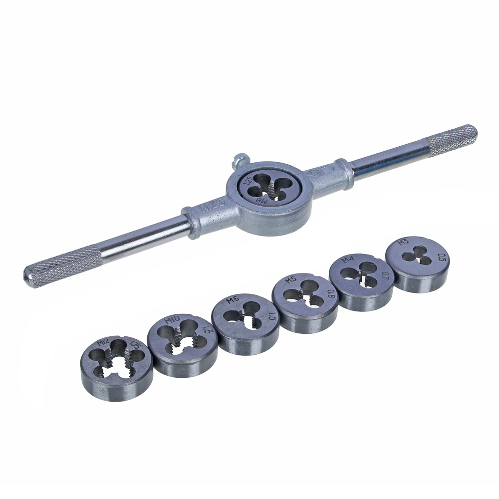 Набор плашек М3-М12 из 8 предметов позволяет нарезать наружную и внутреннюю резьбу на металлических деталях. Также он применяется для восстановления сорванной резьбы. Набор предназначен для ремонтных работ, используется в профессиональной и бытовой сфере.