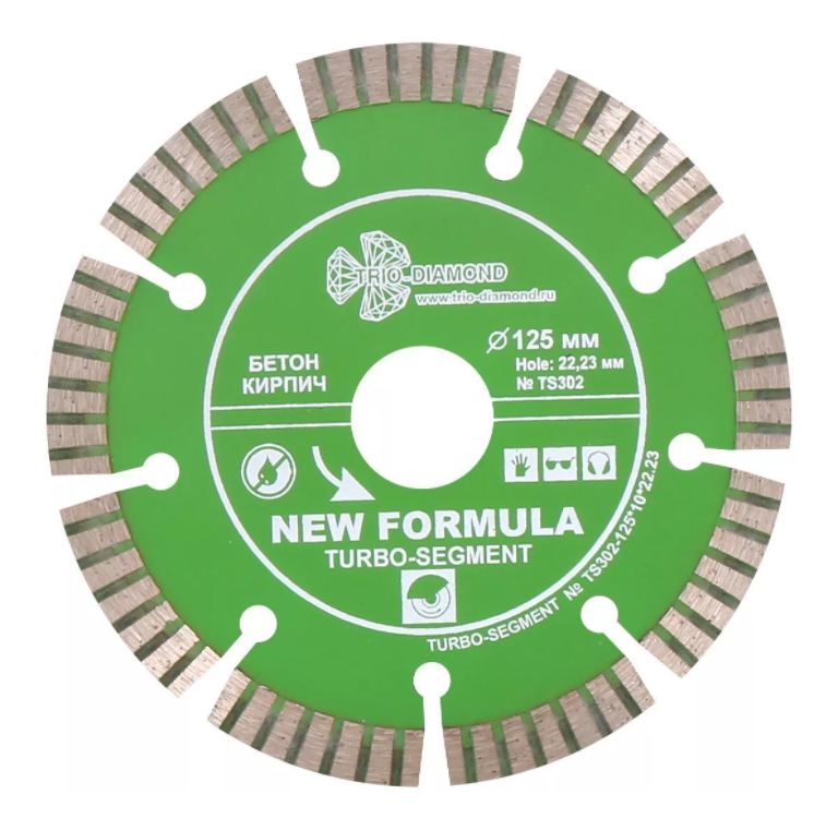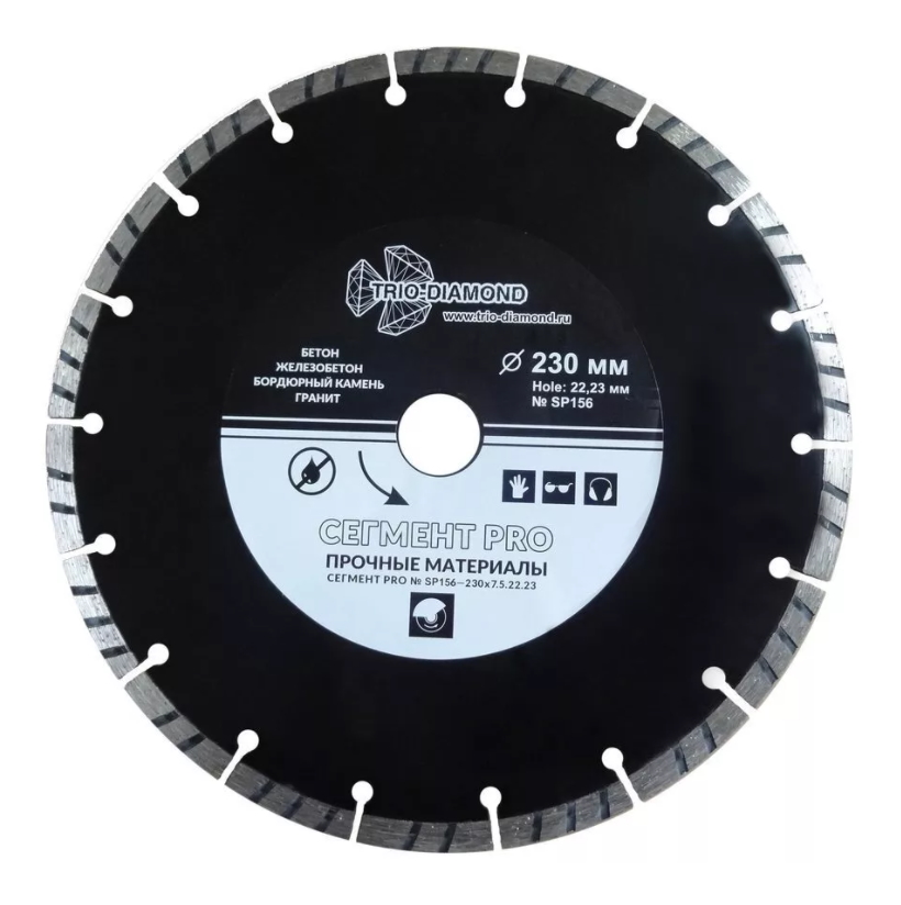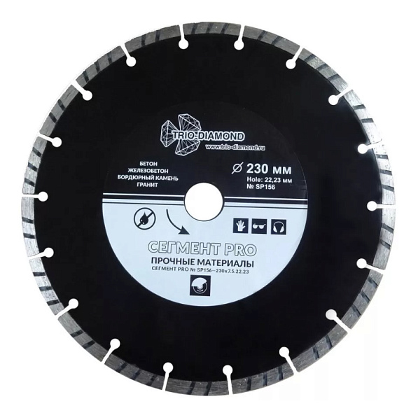 Назначение: слабо армированный бетон, бетон, бордюрный камень, огнеупоры. Особенности: сегментный диск с турбо - сегментной режущей кромкой и повышенной износостойкостью. Технология производства: Холодное прессование
