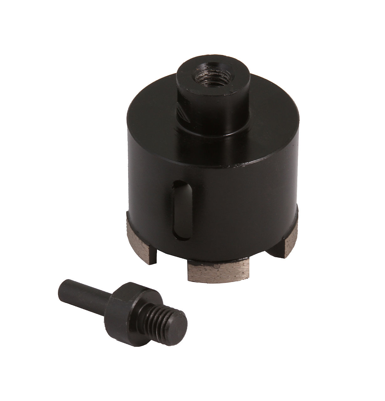 • коронка оснащена съемным цилиндрическим хвостовиком с резьбовым соединеникм М14 что позволяет делать отверстия с помощью дререй и УШМ