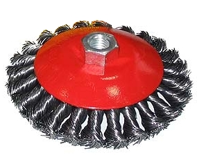 Щетка «тарелка» с крученой проволокой 0,5 мм, устанавливается на УШМ при помощи гайки М14. Выполнена в форме тарелки, за счет чего подходит для грубой (черновой) обработки плоских поверхностей и углов. Удаляет ржавчину, загрязнения, лакокрасочные покрытия, подходит для зачистки сварных швов. Для долгого срока службы щетки рекомендовано использование на скорости до 12500 об/мин. Преимущества Высокий ресурс — проволока изготовлена из высококачественной стали. Одна щетка для разных поверхностей — универсальная насадка позволяет обрабатывать различные твердые материалы: металл, древесину, пластик, бетон. Стойкость к коррозии — на корпус нанесено эмалевое покрытие, щетина покрыта маслом.