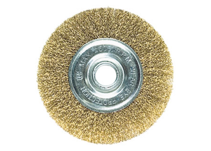 Щетка металлическая плоская, мягкая проволка Щетка плоская по металлу, мягкая (латунированная) проволока, предназначена для очистки металлических поверхностей от ржавчины и грязи в щадящем режиме при работе на УШМ. Стальная проволока с латунным покрытием диаметром 0,3 мм. Гофрированные мягкие щетинки щетки позволяют обрабатывать поверхности из цветных металлов, например алюминия. Точечная сварка конструкции способствует работе на больших оборотах. Скорость вращения - 4500 об/мин.