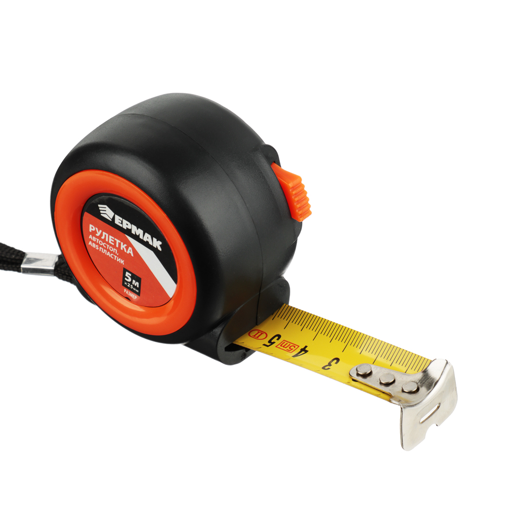 Рулетка ЕРМАК «Автостоп» 5 м х 25 мм с желтой лентой из высококачественной инструментальной стали с антикоррозионным покрытием – незаменимый инструмент в строительстве и ремонте для проведения высокоточных измерений. Имеет прочный жесткий корпус из ABS-пластика, не боится падений и устойчив к механическим повреждениям. Функция «автостоп» предназначена для фиксации ленты. Лента гибкая, прочная, не ломается и хорошо держит форму за счет увеличенной ширины 2,5 см. На корпусе имеется металлический держатель, а также шнурок для удобства переноски или хранения на крючке.