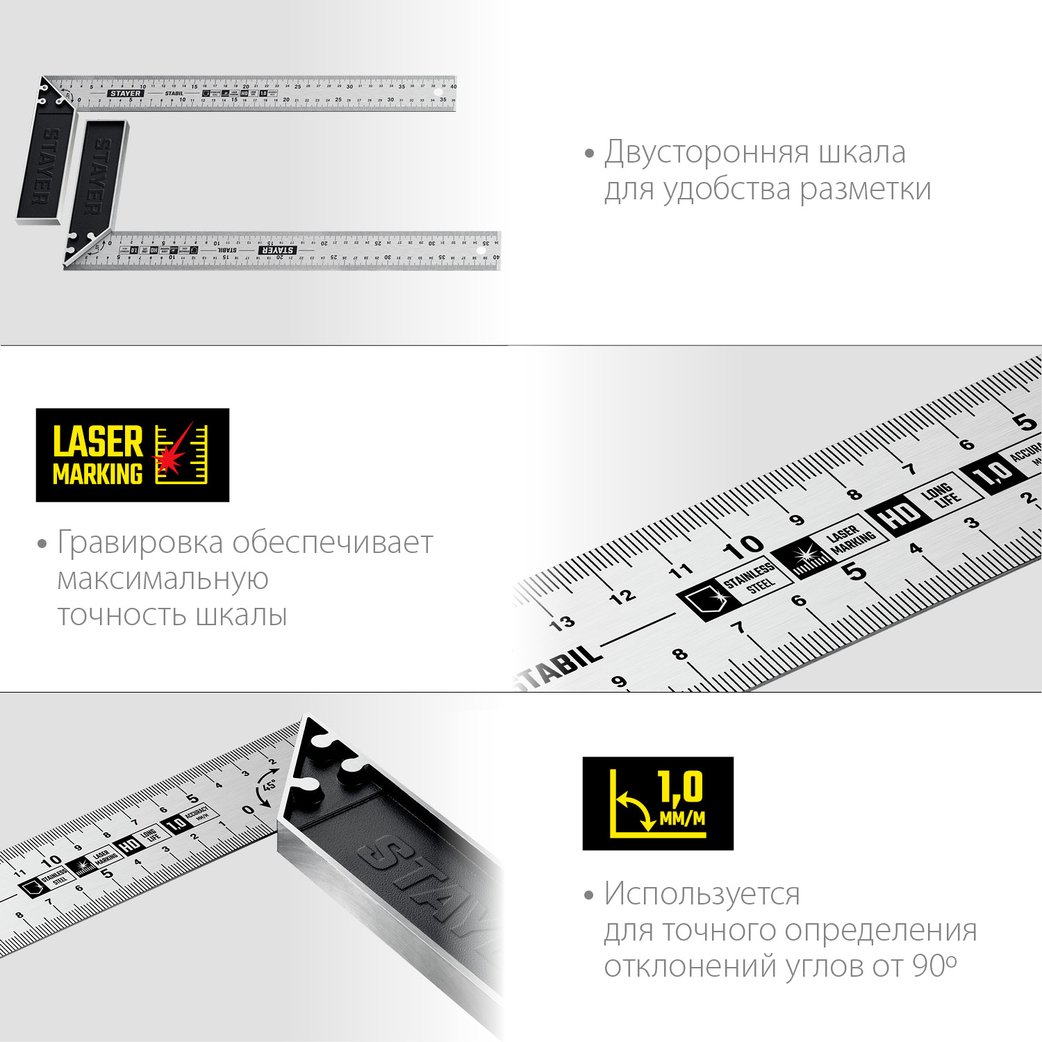 Угольник STAYER PROFI представляет собой столярный измерительный инструмент. Служит для проверки прямых углов у обрабатываемых изделий. Он имеет двустороннюю разметку, что обеспечивает высокую точность при выполнении работ. Шкала на угольник нанесена при помощи гравирования. Предназначен для профессионального применения. Обладает повышенным ресурсом, обеспечивает длительную и качественную работу.