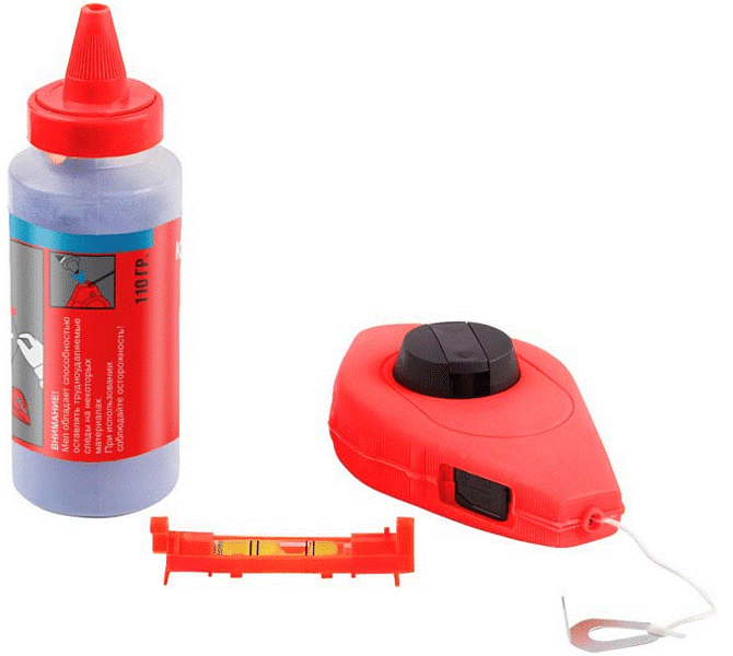 Разметочный шнур + порошок применяются при строительных и отделочных работах. В конструкции предусмотрена откидная рукоятка - для быстрого сматывания шнура. Длина разметочного шнура - 30 м. На корпусе расположено отверстие со сдвижной крышкой - для заполнения мелом. Крючок для закрепления шнура изготовлен из нержавеющей стали. В комплекте входит мел - краска синего цвета и пузырьковый уровень для горизонталей.