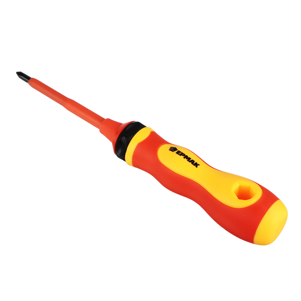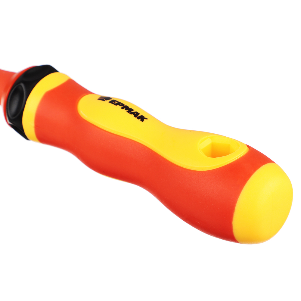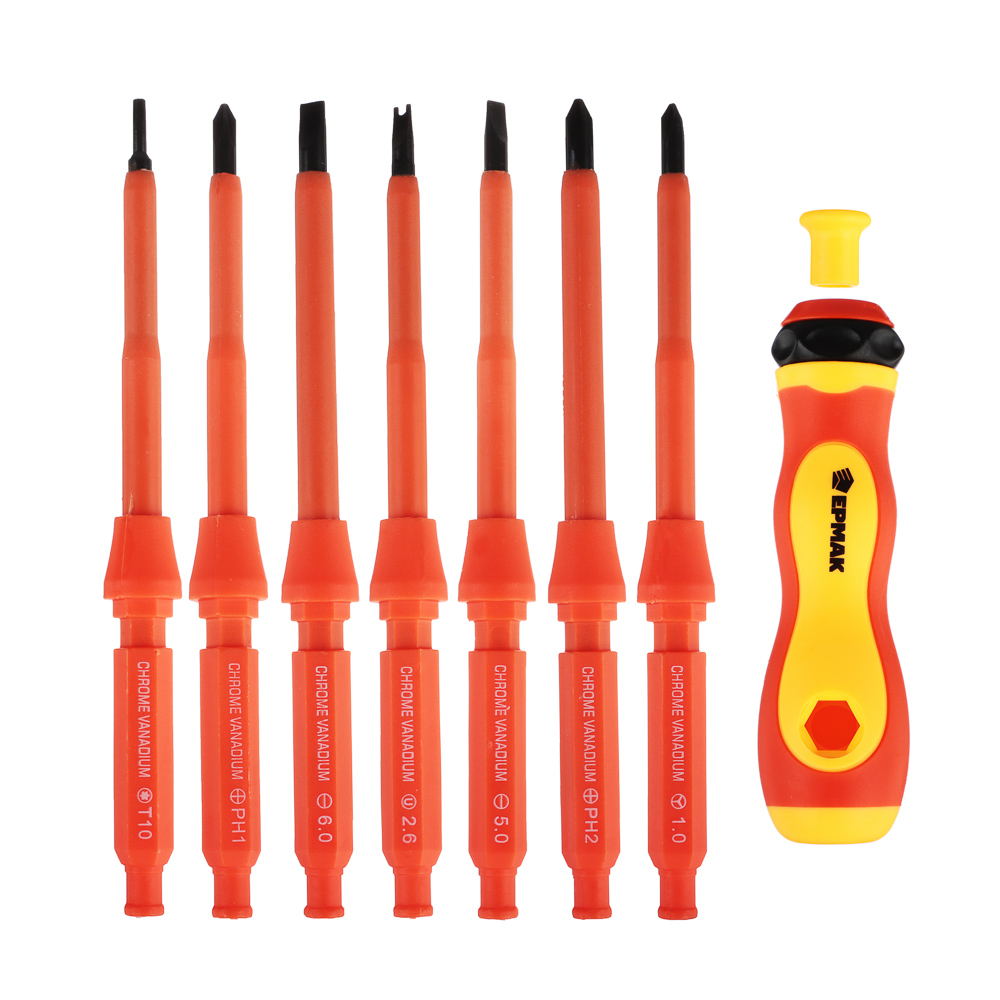 Набор диэлектрических отверток от ЕРМАК представляет собой набор инструментов, разработанных специально для работы с электрическими устройствами и проводами. В комплект входит 9 элементов разного размера с крестовым усиленным и прямым шлицем. Изделие изготовлено из хромованадиевой стали, которая устойчива к повышенным нагрузкам. Диэлектрическая поверхность позволяет работать под напряжением до 1000 В. Диэлектрическое покрытие предотвращает возможность поражения электрическим током, что делает этот набор идеальным выбором для электриков, инженеров и всех, кто работает с электричеством.