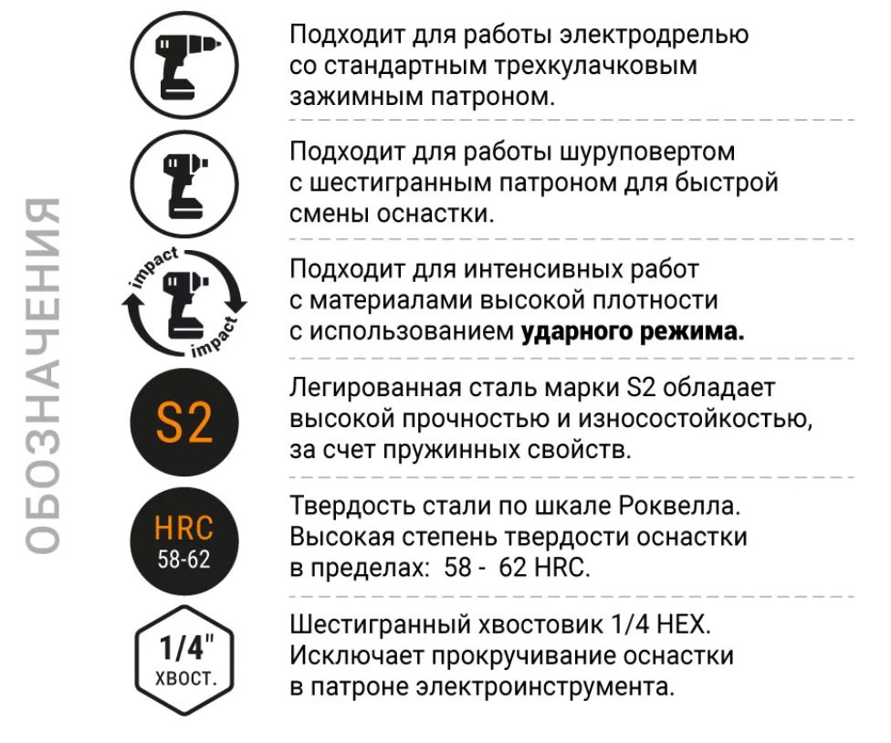 Шестигранный хвостовик HEX исключает проскальзывание оснастки в патроне электроинструмента.