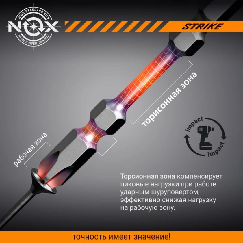 Торсионная бита NOX STRIKE – профессиональная бита c повышенным ресурсом и износостойкостью. Предназначена для использования с электроинструментом в ударном режиме.