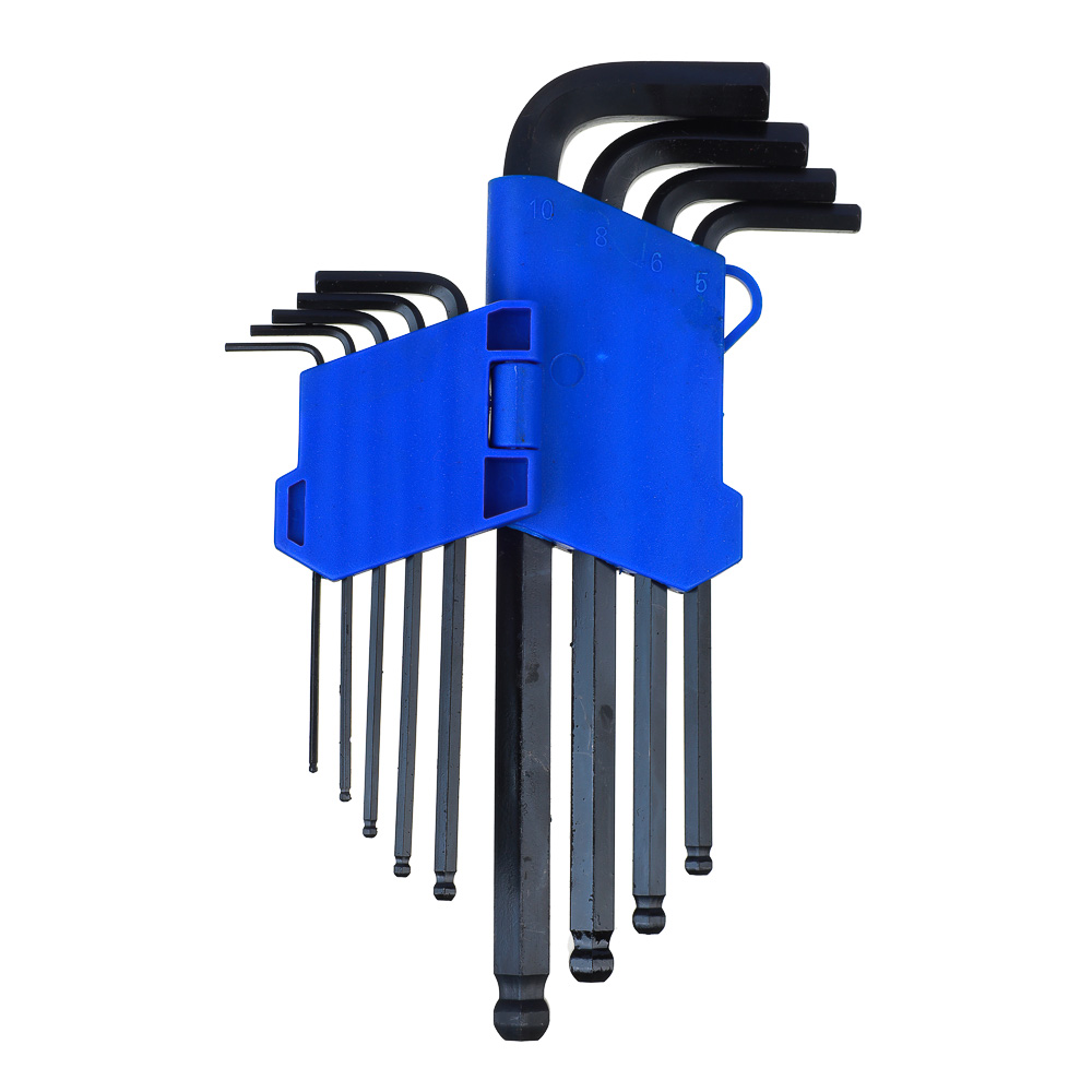 Набор ключей-шестигранников 1.5-10 мм для работы с крепежными элементами включает 9 удлиненных шестигранников с шаром разного размера. Все ключи изготовлены из качественной инструментальной стали, устойчивой к деформации. При работе в труднодоступных местах удлиненный конец может быть использован в качестве рабочего. В комплекте удобный футляр для хранения с маркировкой размеров.