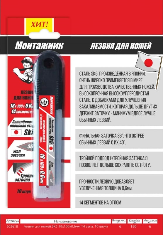 Лезвия сменные 18х0.6мм SK5 инструментальная сталь (10шт/уп)