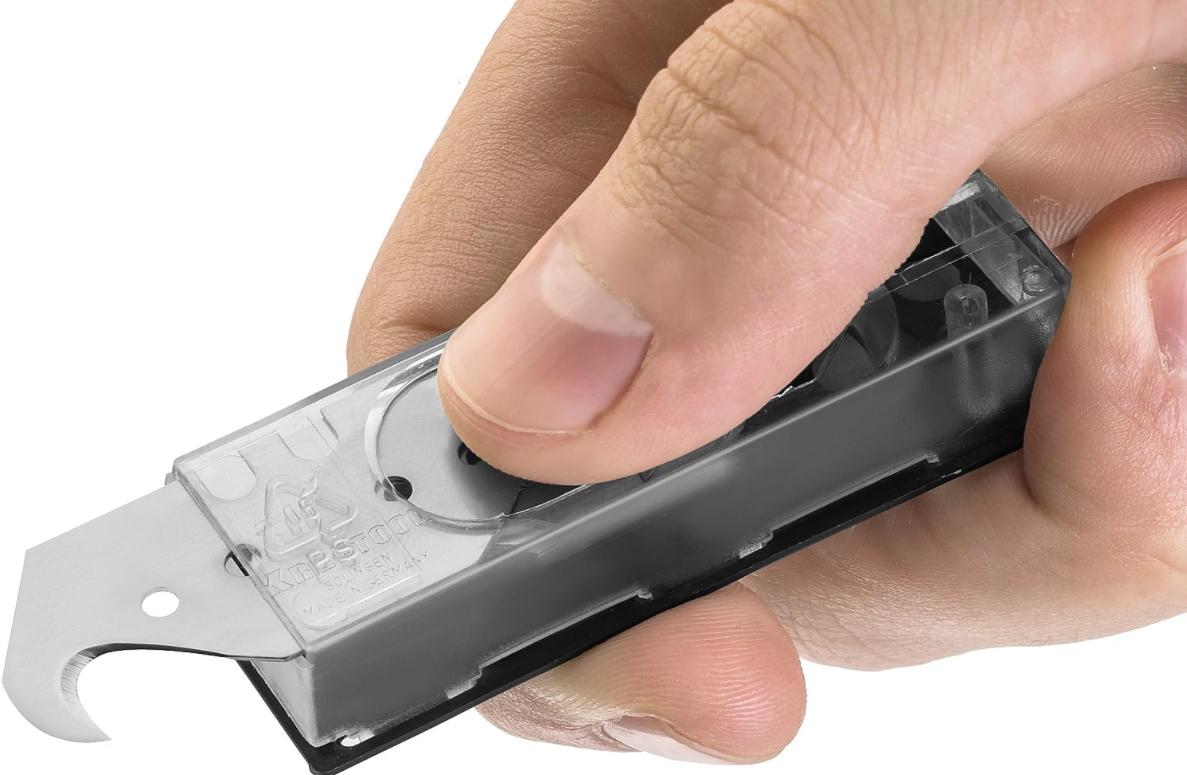• Крюковидная форма лезвия позволяет выполнять рез, не повреждая поверхность под материалом