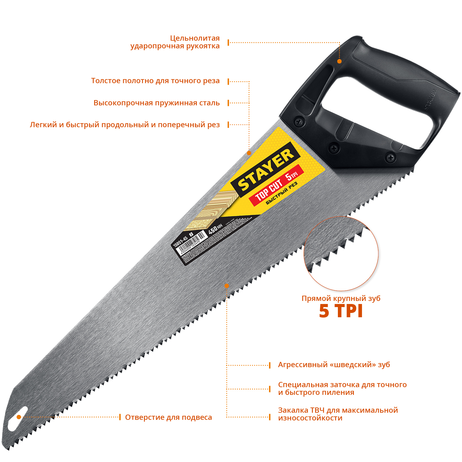 Ножовка по дереву 400мм 5 TPI быстрый рез STAYER TopCut