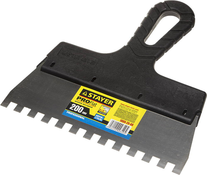 Благодаря зубчатой кромке шпатель идеально подходит для работы со строительными и клеевыми смесями, полотно из нержавеющей стали обеспечивает надежность и долгий срок службы, а удобная пластмассовая рукоятка создает условия для комфортной работы
