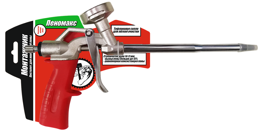 Идеальный пистолет для монтажной пены: полностью металлический, удобная ручка, расширенное дуло для качественного пенообразования, тефлоновый наконечник для очистки, цельнометаллический адаптер под баллон.