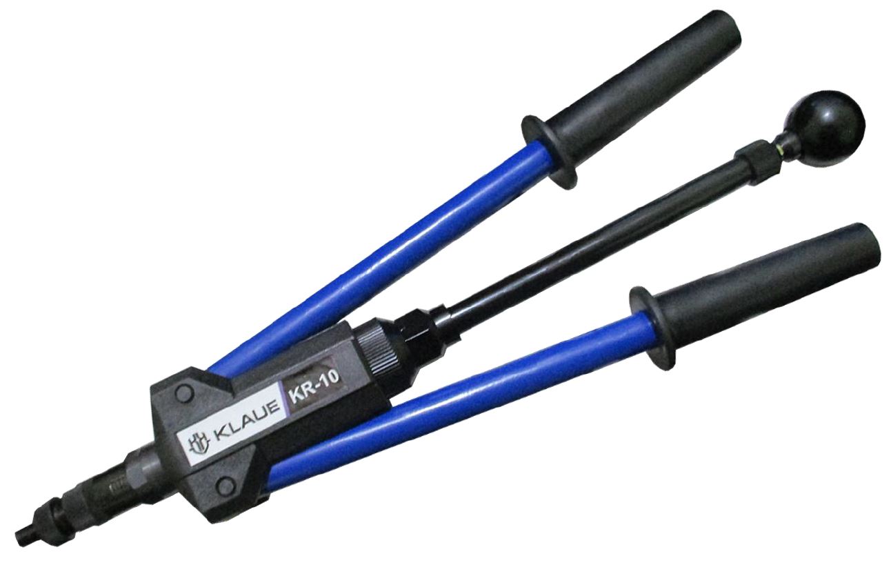 Ручной заклепочник для стальных, алюминиевых и нержавеющих резьбовых заклепок средних и больших размеров. Размер ручного заклепочника зависит от диапазона размеров применяемых клепок. Модель KR-10 клепальника ручного для профиля и других листовых материалов предназначена для резьбовых заклёпок - М5, М6, М8, М10.