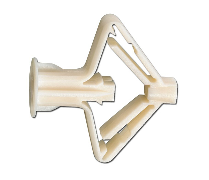 Полипропиленовый распорный дюбель. Это многофункциональное крепление для листовых материалов толщиной от 10 мм. Конструкция дюбеля препятствует перекручиванию и перетягиванию при монтаже. Установка дюбеля выполняется легко и быстро. Применяется для крепления светильников, плинтусов, выключателей, кабельных каналов к гипсокартону, ДСП, ацеиту, фанере.