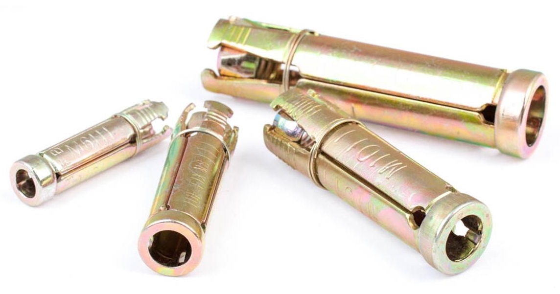 Анкер втулочный (четырехраспорный) предназначены для высоких нагрузок и монтажа конструкции к полнотелому бетону, природному строительному камню. Представляет собой полую гильзу, на конце которой находится сердечник (конус) с внутренней резьбой. Специальные выступы на расклинивающихся лепестках позволяют избежать прокручивания при монтаже. Втулочный анкер из оцинкованной углеродистой стали с защитным слоем покрытия в 8-10 микрон. Для надежного крепления необходимо тщательно очистить отверстие от пыли и бетонной крошки. При расчете рекомендуется учитывать не только диаметр выбранного анкера и глубину его установки, но и минимальные межосевые расстояния между соседними анкерами, и минимальное расстояние до края основы.