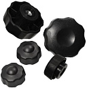 Рукоятки звездообразные DIN 6336 форма D с внутренней резьбой (с гайкой). Материал ручек: - термопласт черный, - резьбовая втулка из оцинкованной стали с синим хроматированием.